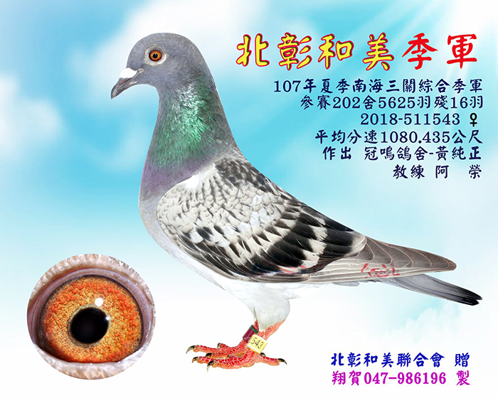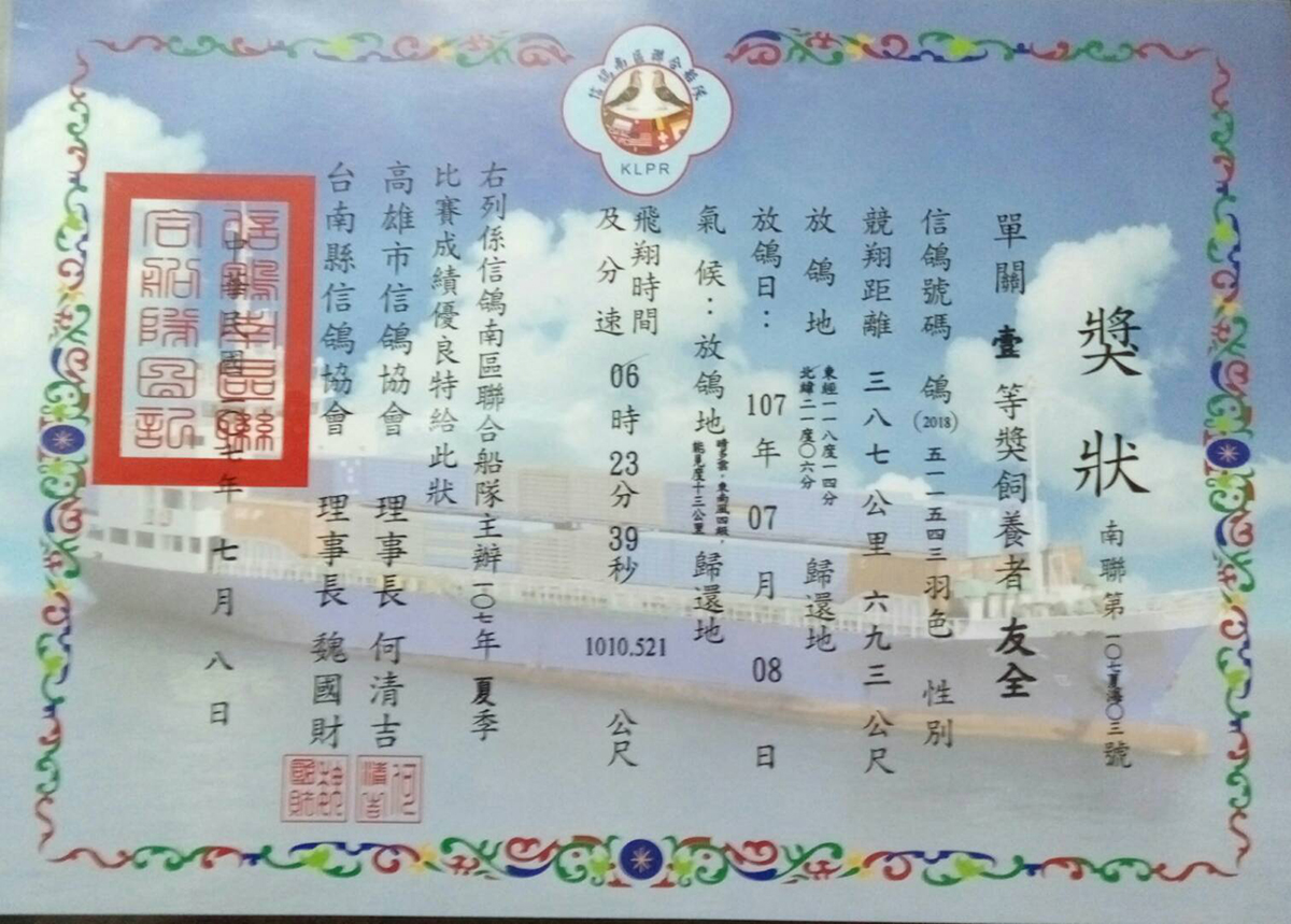 直女 : K.20-837813 斑 天宇支會夏季五關綜合338位 父鴿 : K.14-562664 斑 灣內支會夏季五關綜合88位[殘355羽] 祖父 : T.11-862484 斑 本身未賽 修伯特238'X修伯特424' 祖母 : C.12-832780 斑 布袋夏季資格二失格 布袋287'X布袋199' 母鴿 : K.14-562791 灰白羽 灣內支會夏季五關綜合224位[殘355羽] 祖父 : K.07-505053 斑 雙連支會夏季五關綜合52位 祖母 : K.07-280001 灰白羽 直子2010年布袋夏季五關綜合33位 上一羽鴿 | 下一羽鴿 ![]() |