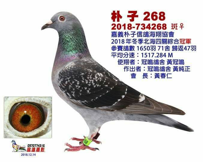 父鴿 : T.16-773519 斑 本身未賽 祖父 : C.08-885515 灰 本身未賽[小斑982"X冠鳴金母"] 祖母 : T.02-897077 斑 小斑金母077"[小斑982"X金母815"] 母鴿 : T.16-773528 斑白羽 本身未賽 祖父 : K.13-864565 斑白羽 灣內夏季五關綜合77位[扎羅士372"X修伯特金母370"] 祖母 : K.13-864562 斑白羽 灣內夏季五關綜合70位[小斑085"X扎羅士186"] 上一羽鴿 | 下一羽鴿 ![]() |