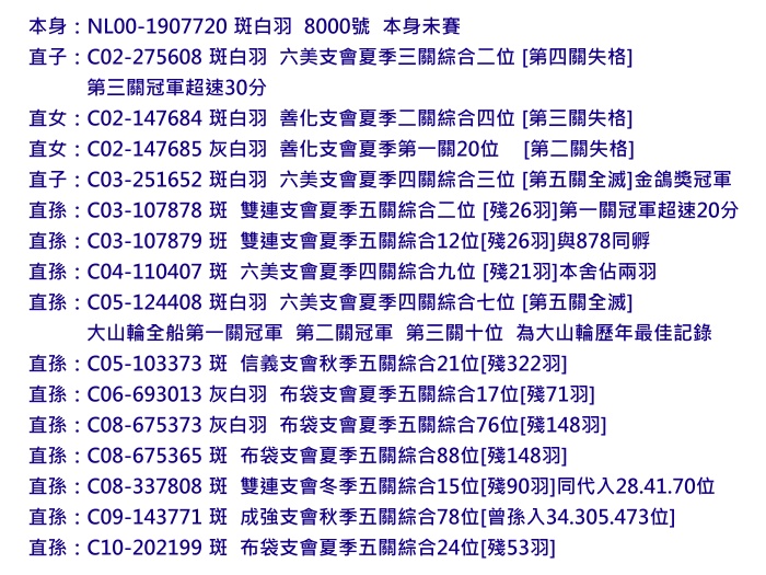 子孫輩獲: 1位[7260羽] 1位[4471] 1位[2607羽] 1位[2600羽]1位[1697羽] 2位[1212羽 3位[7260羽]