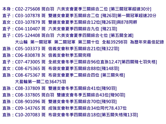 NPO全國W.H.Z.B老鴿組第五位AS鴿王 1989年NPO全國W.H.Z.B中距離第12位AS鴿王