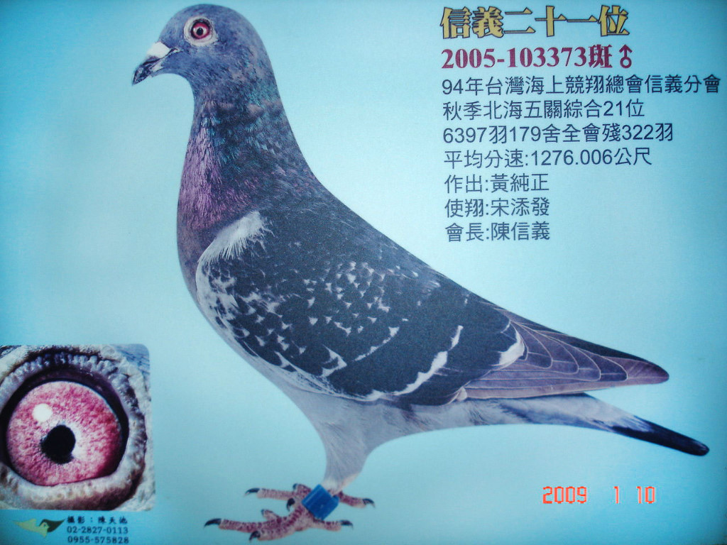 直子 : C.08-337805 斑白羽 雙連支會冬季五關綜合43位[殘90羽] 直女 : C.09-143764 斑 成強支會秋季五關綜合473位 直子 : C.09-143765 斑 成強支會秋季五關綜合34位 直子 : C.10-207083 斑 布袋支會冬季四關綜合18位 [第五關失格殘13羽] 直孫 : C.10-207089 斑 布袋支會冬季三關綜合四位 [第四關失格殘30羽] 直子 : K.13-786048 斑 雙連西會夏季淘汰組入賞 孫女 : T.14-600805 斑 桃園聯合第五關失格 孫女 : T.14-600806 斑 桃園聯合第五關失格 孫女 : 台.15-800284 斑 新和順冬季四關綜合21位[第五關失格]2.3.4.關入賞 父鴿 : C.03-302942 斑 東昇夏季第一關失格 本身交配兩羽母鴿 作出南北海入賞鴿 祖父 : NL.00-1907720 斑白羽 "八千號"本身未賽 下代南北海入賞數十羽[荷蘭.扎羅士父子作出] 祖母 : C.00-309352 斑白羽 "種母352"本身未賽 下代南北海入賞數十羽[二代X三代近親作出] 母鴿 : C.03-107879 斑 雙連支會夏季五關綜合12位[殘26羽]同孵綜合二位 祖父 : C.02-275608 斑白羽 六美支會夏季三關綜合二位[第三關冠軍超速30分]"八千號" 直子 祖母 : C.02-275602 斑 六美支會夏季二關開.淘汰組入賞[第三關失格]"鎮舍金母" 直女 上一羽鴿 | 下一羽鴿 ![]() |
